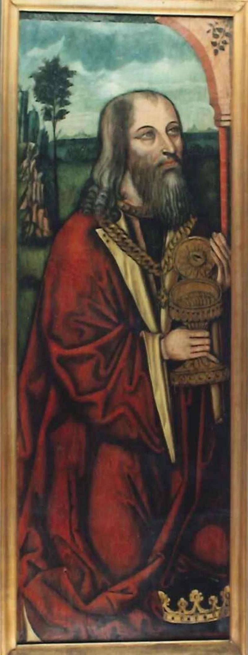 Rei Mago ajoelhado, tendo nas mãos um copo com moedas; a seus pés, uma coroa. Apresenta-se adornado com um manto vermelho e um grosso cordão ao pescoço. Encontra-se (na parte direita do quadro) junto a uma coluna, que sustenta um ábaco. Em segundo plano, uma paisagem onde predominam o verde e o azul.