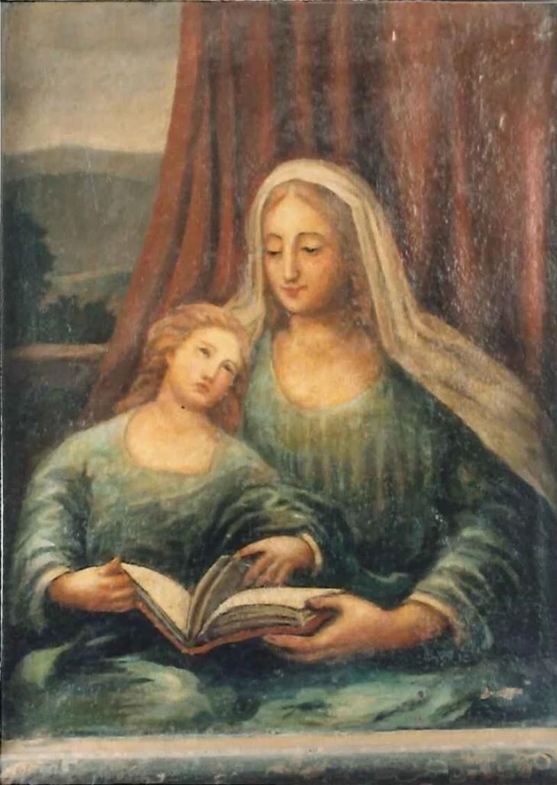A Virgem encosta-se ao ombro de Santa Ana enquanto folheia um livro. Por trás uma cortina vermelha como fundo e, ao lado, uma paisagem.