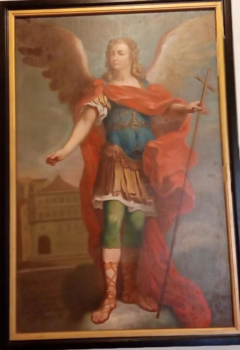 São Miguel ou o Anjo Custódio é aqui representado em traje de centurião romano, de vasta capa vermelha esvoaçante, cheia de dinamismo, embora a sua atitude seja estática e a fisionomia serena. Segura na mão esquerda uma cruz dourada enquanto que com a direita aponta para baixo. A atmosfera que o envolve é luminosa e de tons claros. Como fundo e à sua direita, alguns edifícios de um cenóbio. No canto inferior esquerdo a legenda: "quen vides militem angelus custos est, quam spectas molem, cacnobium arouquensse. quod ilee servans dum moniabs recit truque defendit". Assinado e datado por And glz F. 1745.