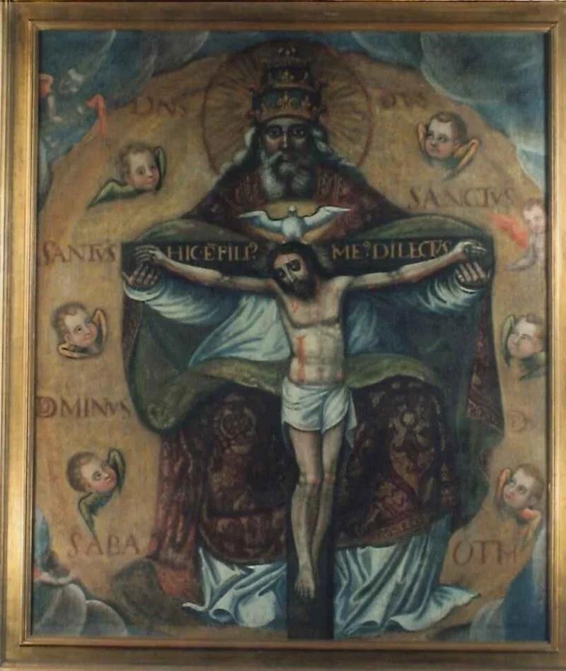 Deus Pai é representado sob a figura de homem, com cabelos brancos ondulados compridos e barba branca. Na cabeça tem uma rica mitra azul com dourados e auréola. Veste manto ricamente adornado sobre uma túnica branca. Nas mãos segura o madeiro da cruz no qual, em ponto mais pequeno, está suspenso Cristo morto. Sobre a cabeça de Cristo, a pomba do Espírito Santo. Nos braços da cruz, a legenda: "HIC E. FILI? ME? DILECTUS". A composição é circundada por querubins intercalados pelas legendas: " DNS; SANCTUS; DOMINUS; SABAOTH" e ainda enovelamentos de escuras nuvens nos ângulos.