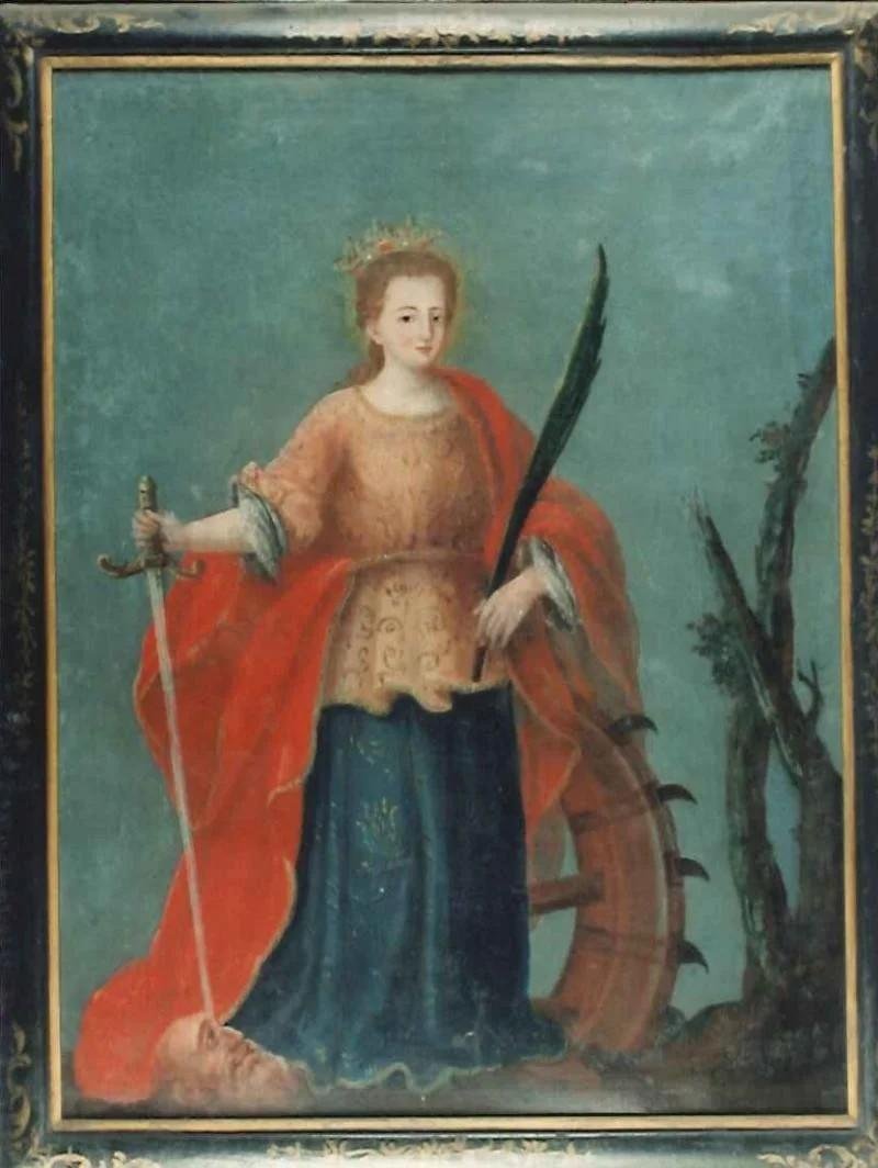 Santa Catarina é representada em corpo inteiro, vestindo túnica castanha curta, sobre saia azul e manto vermelho e coroa na cabeça. Na mão direita segura uma espada pelo punho, cujo bico se apoia a seus pés sobre a cabeça decepada de um velho, com os olhos abertos. O braço esquerdo segura o manto e uma palma, símbolo de martírio. Por trás da personagem , uma roda dentada e, ao lado, dois troncos de árvore secos, destacando-se sobre um fundo azul monocromo. Moldura preta com decorações florais a dourado. Não assinado.
