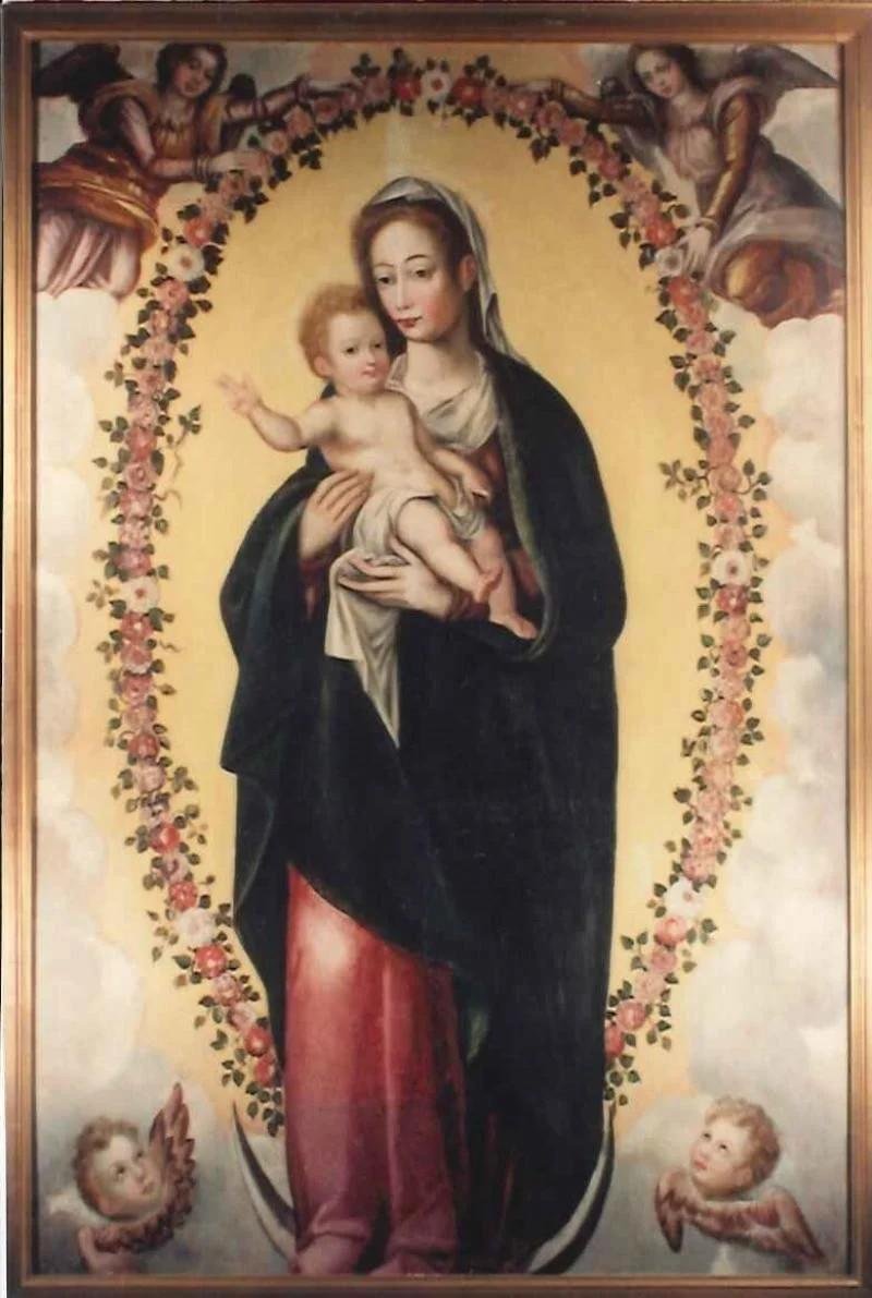 Virgem representada a corpo inteiro, de túnica vermelha, manto azul e véu branco, vence o mal, representado pelos chifres a seus pés. Nos seus braços o Menino envolto em panos, abençoa com a mão direita, ainda que a composição revele pouco movimento nas figuras. Mãe e filho, representados com semblantes serenos, são circundados por um aro de rosas e por enovelamentos de nuvens, surgindo na parte superior dois anjos e dois querubins na parte inferior do painel.