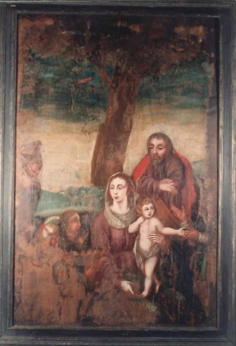 Representação da Sagrada Família, tendo Nossa Senhora o Menino de pé, no seu regaço e S. José de pé, de braços cruzados. No lado esquerdo do painel os Reis Magos com os seus presentes, ajoelham-se, apresentando-se dois de coifas listadas. O Menino, por seu lado, está atento à personagem que se encontra no lado direito, provavelmente um pastor, sendo visível apenas as duas mãos e o antebraço esquerdo deste. A cena do presépio decorre num espaço exterior, uma vez que tem como fundo o tronco de uma árvore frondosa e a representação de algumas colinas. Predominam os tons castanhos e verdes.