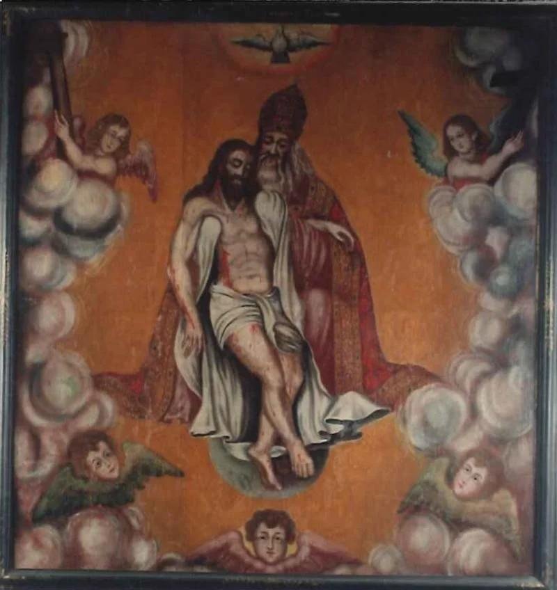Representação da Santíssima Trindade assumindo Deus Pai a forma de homem idoso, de mitra, barbas brancas e cabelo comprido, envolto num rico manto vermelho de bainha dourada, segurando Cristo morto nos braços, este semi envolto no sudário. Sobre as duas figuras divinas desce a luz do Espírito Santo sob a forma de pomba. Enovelamentos de nuvens e querubins cercam a tríade suspensa sobre um fundo dourado. Destaque para os dois anjos superiores que carregam os atributos da Paixão de Cristo ( cruz e a coluna).