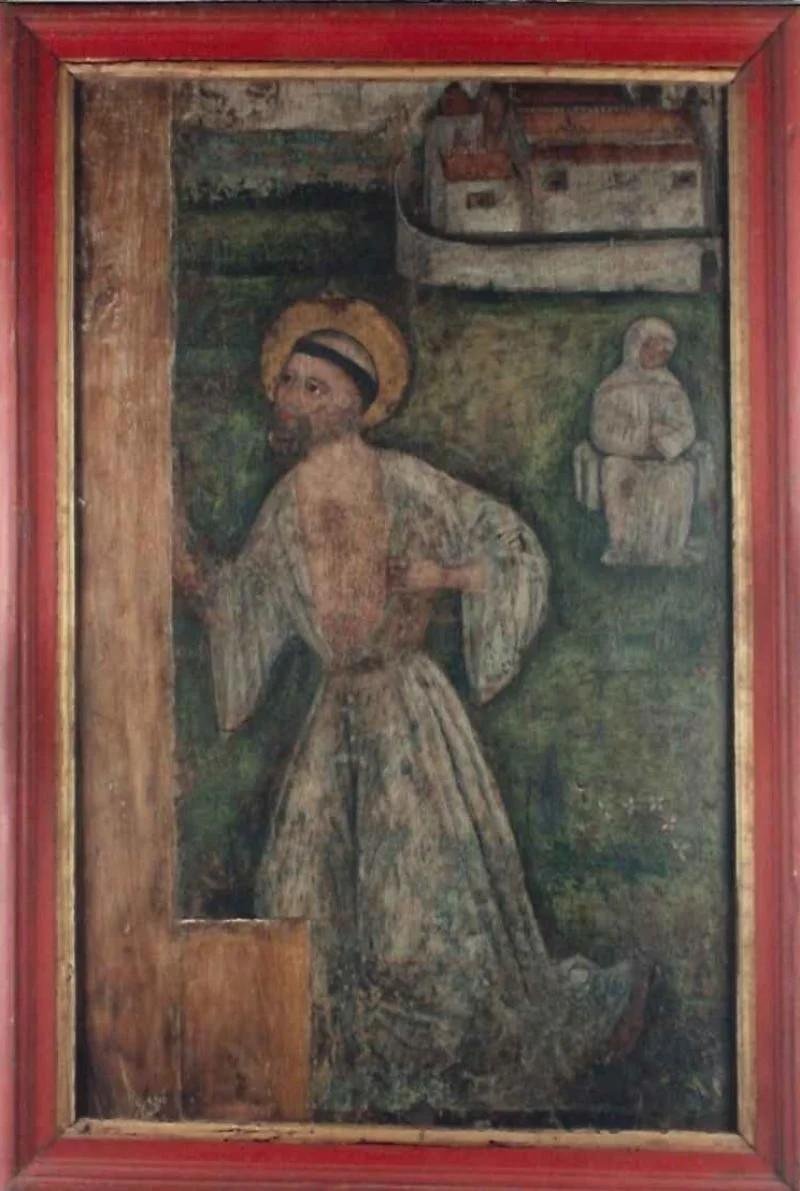 São Francisco, ajoelhado, de vestes brancas e auréola dourada na cabeça. A mão esquerda puxa a veste no peito. Mais atrás , um frade sentado, inclina a cabeça para o ombro esquerdo, parecendo dormitar. Ao fundo o cenóbio,rodeado por um muro. predomina o verde do relvado.