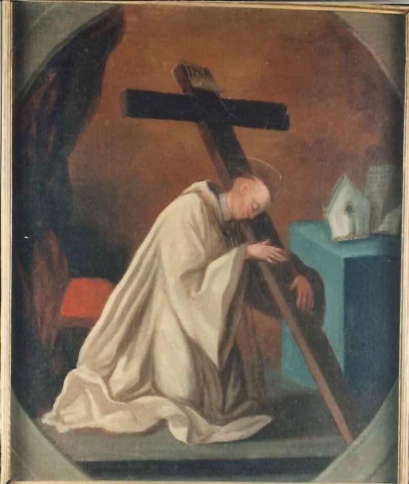 São Bernardo, de amplo hábito cisterciense, está ajoelhado e segura uma cruz que apoia contra o seu ombro esquerdo. A sua cabeça, inclinada sobre o madeiro, está aureolada.. As mãos envolvem o madeiro. No topo da cruz, a inscrição: "J. N. R. J.". Ao seu lado esquerdo, uma mesa coberta com uma colcha azul, sobre a qual se encontram a mitra do santo e o livro de orações, de páginas abertas e em pé. No lado oposto um banco com almofada vermelha e um cortinado escuro, corrido. Os ângulos são atenuados por 1/4 de círculo, o que parece inscrever a pintura dento de uma forma quase circular. Moldura preta com decoração estilizada dourada. Não assinado.