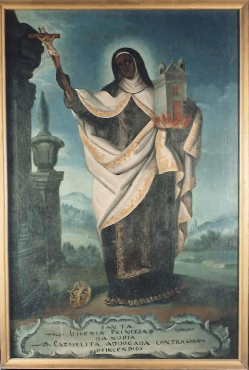 Santa Efigénia representada como uma santa negra, de corpo inteiro, traja hábito castanho escuro e manto branco, ambos com bainha de motivos dourados. Segura a ponta do manto no braço esquerdo e, na mão a maquete de um igreja de cuja parte inferior saiem chamas. Na mão direita, mais elevada, um pequeno crucifixo. A seus pés uma coroa tombada. Ao lado , parte de uma arquitectura barroca e algo que parece ser um vaso. Como fundo, uma paisagem e um céu azul. Na parte inferior do painel, inscrito dentro de um friso de motivos concheados, a legenda: "Santa Ifigénia Princesa da Nubia. Carmelita, advogada contra os incêndio". Moldura preta e dourada. Não assinado.