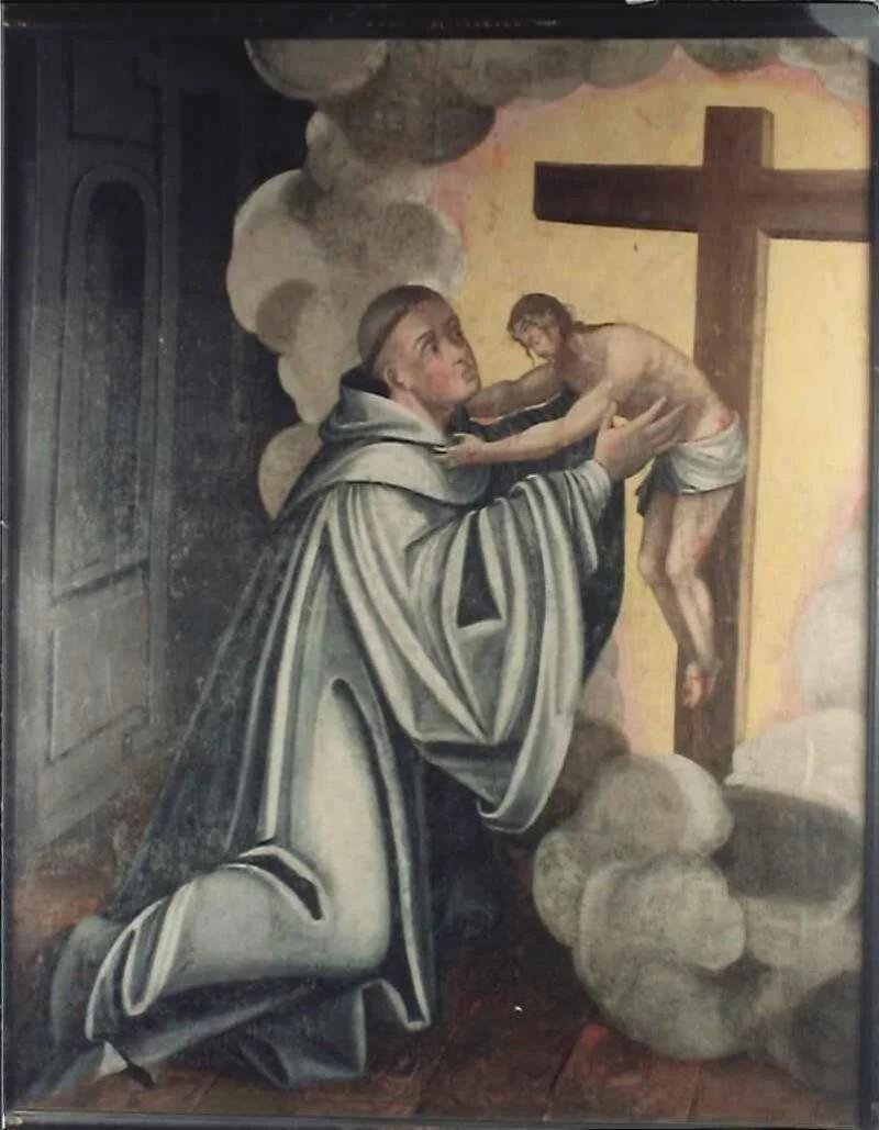 Representação de São Bernardo, de amplo hábito cisterciense , ajoelhado sobre um chão de tábuas, perante a aparição de Cristo envolto num enovelamento de nuvens. Segura nos seus braços Cristo crucificado, meio suspenso na cruz, que coloca os braços sobre os ombros do santo. A cena decorre em espaço interior, provavelmente na cela do santo , figurando um nicho e uma porta no lado esquerdo. Moldura preta com motivos estilizados a dourado.