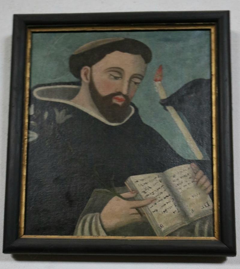 Santo de traje dominicano, representado até meio busto. Na mão direita tem um ramo de açucenas. Segura um livro aberto na outra mão, que se encontra escrito de pernas para o ar. Junto, uma vela que ilumina. Como fundo, um azul monocromo.