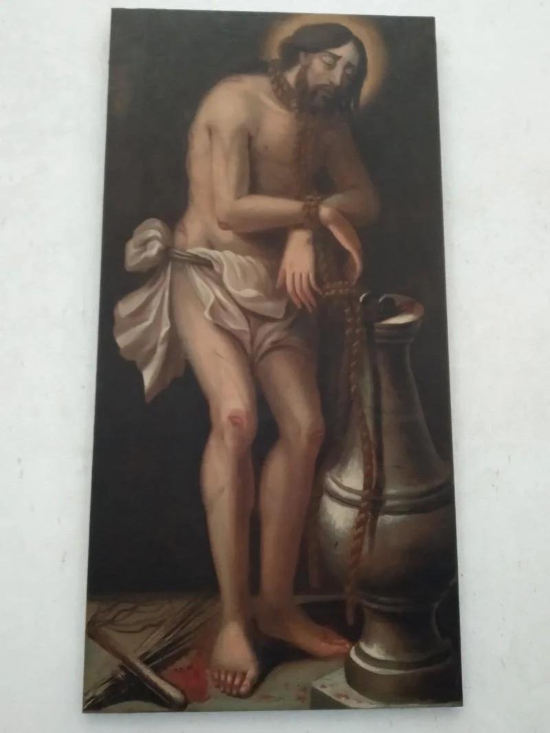 Cristo é representado junto à base de uma coluna , com as mãos e o pescoço presos por uma corda. Despido, apenas traja uma faixa na cintura. Pelo chão, dispõem-se os objetos da tortura: chicotes e varas ensanguentados.