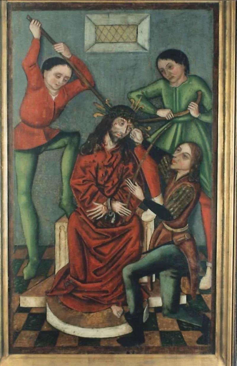 Painel com Cena da Paixão, tendo ao centro a figura de Cristo, em posição frontal e estática, sentado numa espécie de trono, com as mãos cruzadas e presas sobre o regaço; o tratamento das pregas da túnica vermelha que enverga, revela cuidado e a preocupação em conferir volume; a cabeça, levemente inclinada e virada para o seu lado esquerdo, mostra uma fisionomia trabalhada com minúcia como se verifica no olhar melancólico, na barba com as suas nuances, nos cabelos longos e abundantes, na coroa de espinhos que faz brotar gotas de sangue ; o seu olhar fixa-se no personagem semi ajoelhado ao seu lado, destacando-se este pelas vestes ricas que revelam uma posição social mais elevada que as outras personagens, e pelo tratamento mais pormenorizado do rosto e dos cabelos claros compridos e ondulados; este apresenta o punho direito encostado ao rosto de Cristo (?) e a mão esquerda ampara a mesma vara que Cristo segura. Mais atrás, os outros dois personagens tratados de forma vaga, ladeiam Cristo e equilibram a composição; torturam-No com varas, ora pressionando-as num movimento descendente, como é a atitude do algoz de túnica vermelha, ora num movimento lateral como acontece com o algoz de túnica verde. Ambos poisam um dos pés sobre o trono em que Cristo se senta. A cena decorre num espaço interior com poucos elementos arquitetónicos, de fundo monocrómico, destacando-se uma pequena janela envidraçada a encimar a composição e o chão de ladrilhos azuis e brancos, a evidenciar conhecimentos da perspetiva . Nas costas do painel há vestígios de um motivo floral estilizado disposto de forma centrada.