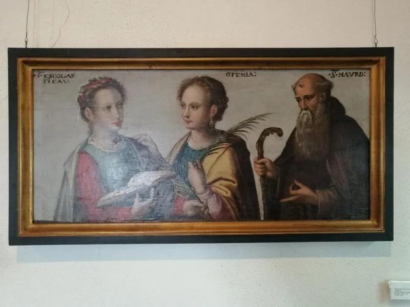 Painel transversal. Representação de três santos. Por ordem, da esquerda para a direita, as inscrições junto de cada figura, Santa Escolástica, Santa Eufémia e S. Mauro. Santa Escolástica tem um livro aberto na mão direita e, na esquerda, uma palma. Santa Eufémia tem na mão esquerda uma palma. S. Mauro segura na ´mão direita um cajado e, na esquerda, as contas de um terço. Figuras representadas até meio corpo, sobre um fundo liso. Moldura dourada e preta.