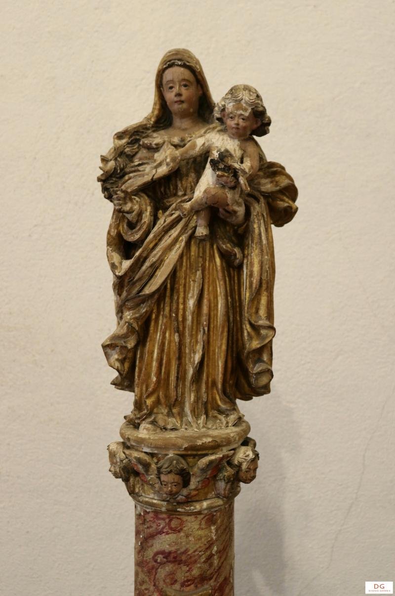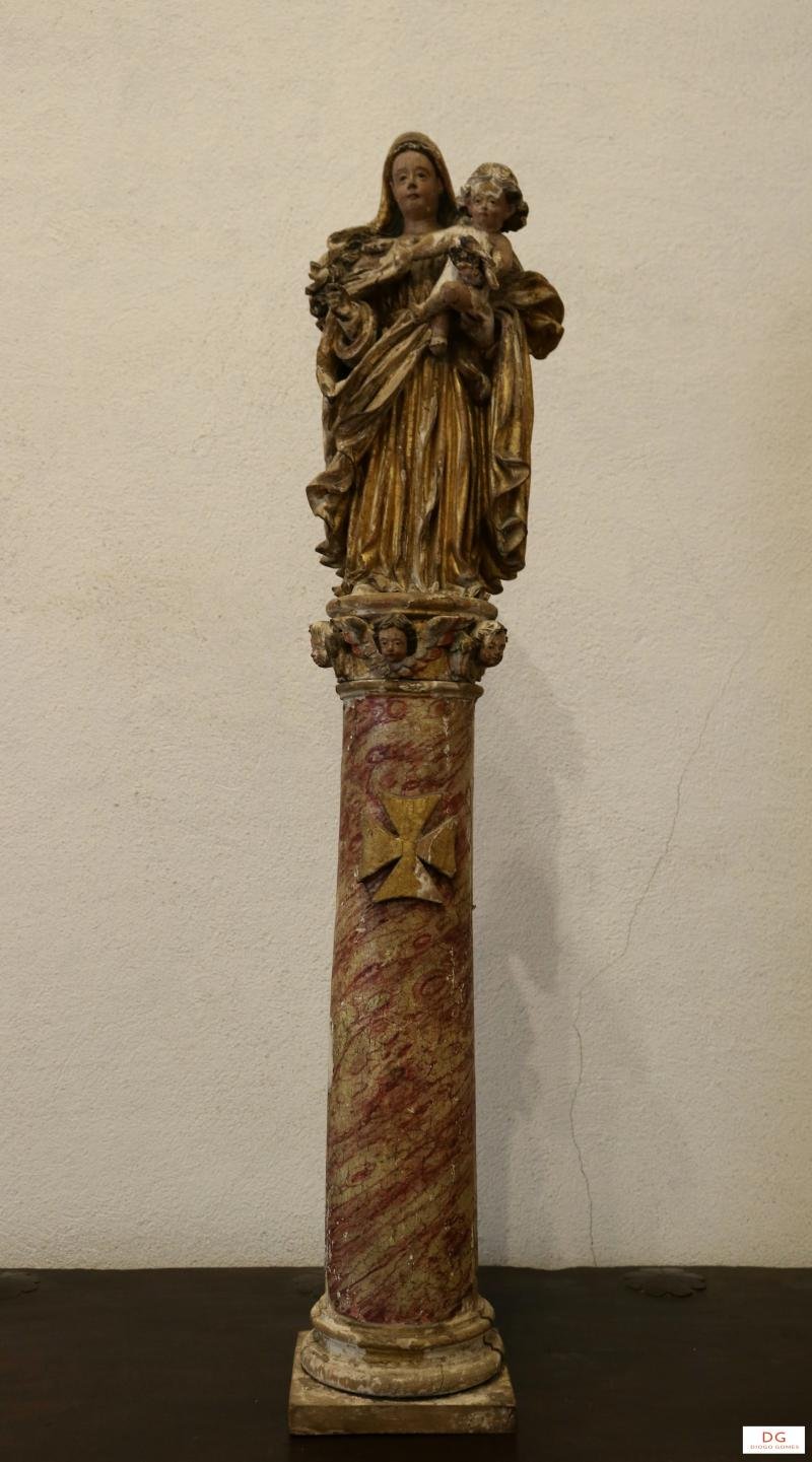 Escultura de vulto pleno representando a Virgem Maria sob a invocação de Nossa Senhora do Pilar. Veste uma túnica e manto dourados. De cabelos compridos e ondulados , tem um véu dourado sobre a cabeça. Segura o Menino nu , sobre o braço esquerdo, agarrando-se este a uma ponta do manto.. O Menino, de cabelos encaracolados, tem na mão esquerda um pássaro. A Virgem está sobre um pilar ou coluna redonda vermelha e branca , apresentando esta três cabeças de anjinhos no topo.. A 3/4 de altura do pilar, surge uma cruz de Malta dourada. A base da coluna é dourada.
