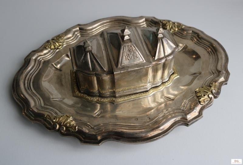 Conjunto dos Santos óleos destinado aos enfermos, composto por salva de formato oval com orla alteada, recortada, decorada com molduras corridas, interrompidas em quatro ângulos por uma tríplice folha de acanto. Na parte inferior da base assentam os três recipientes central e laterais, encaixando em moldura alteada em prata dourada. As caixinhas dispõem de três tampas móveis, altas, em esquadria e coroadas por pináculo, abrindo as duas laterais para os lados, enquanto a tampa da caixa central abre para trás; por sua vez, esta última apresenta a gravação "INF IRMO RUM" (Infirmorum).