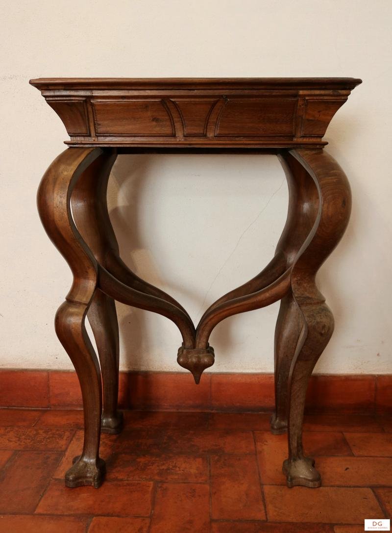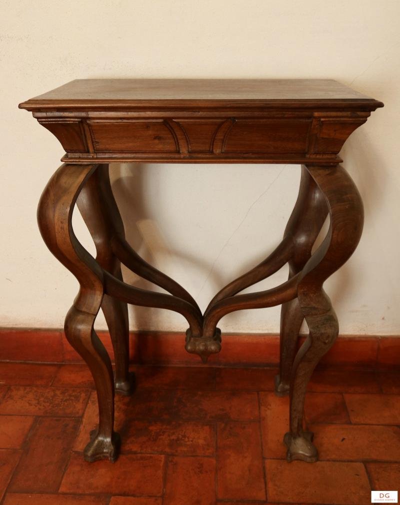 Tampo rectangular com aba reentrante ou côncava e com entalhes em forma de molduras. Quatro perna duplamente onduladas, com duplo joelho sobreposto. Travessas onduladas e articuladas, unidas sob o centro, terminando em um quadrado com as faces trilobadas e cordado por baixo. Pés de garra estilizada. Sobre sapata.