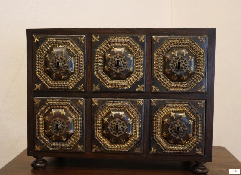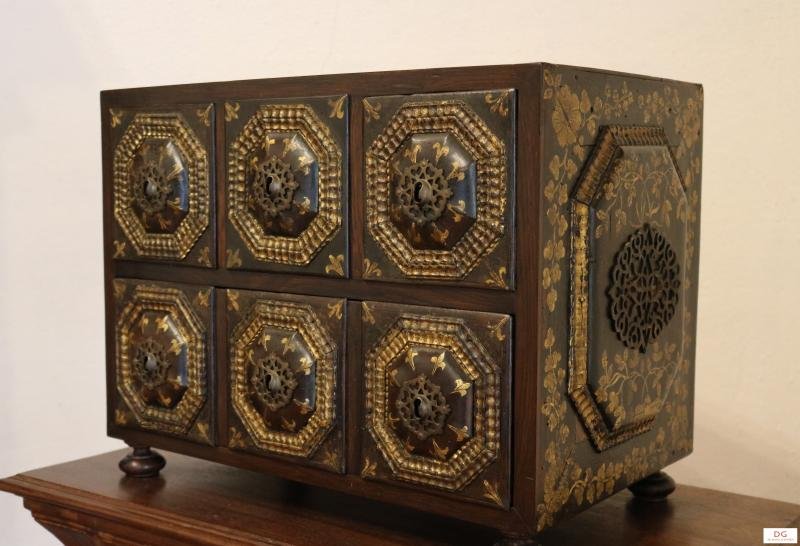 Contador em forma de cofre composto por seis gavetinhas dispostas em duas filas sobrepostas, apresentando estas almofadas de forma hexagonal, com molduras de tremidos em dourado, centradas por fechaduras de espelho recortado e vasado em formas geométricas. Nas ilhargas um almofadado idêntico ao das gavetas, com pegas encordoadas a espelhos recortados. Nos almofadados laterais figura um conjunto de habitações e molduras de flores e folhas dourados que cobrem também toda a parte superior do contador, e pinturinhas ,nas gavetas. Pés esféricos achatados. Falta a pega do lado direito..