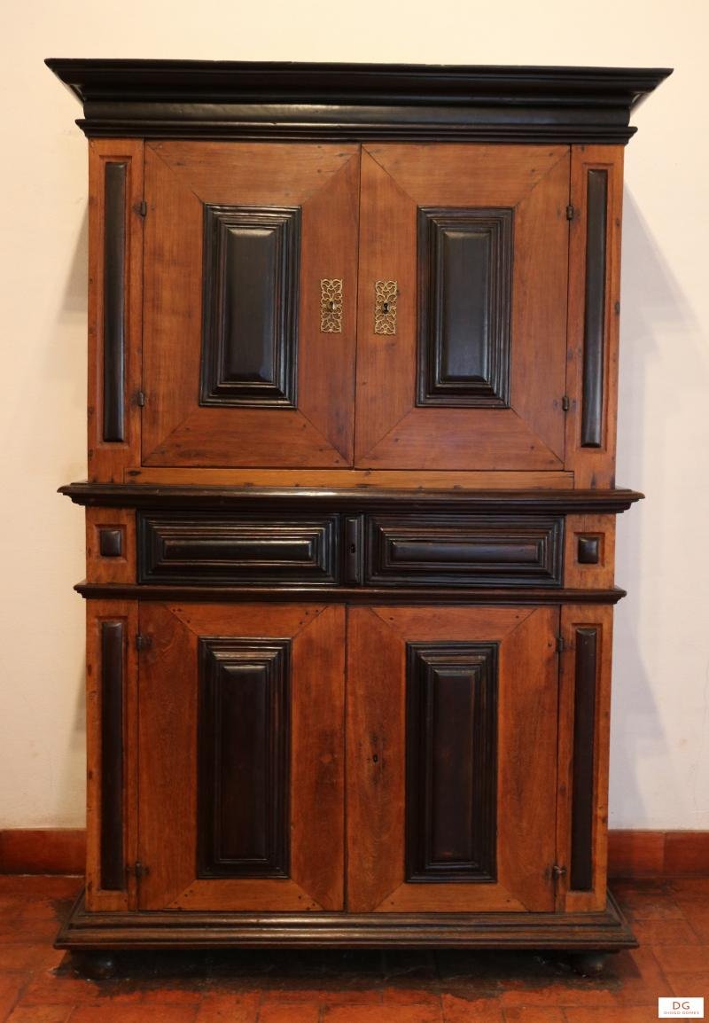 Com dois corpos de duas portas cada, separados por uma andada de gavetas. Em pau santo nas apilastradas de secção convexa, nas molduras acentuadas da cimalha e da base, e nas discretas na separação dos corpos, e no revestimento das almofadas das portas e das gavetas; ilhargas planas; fechaduras com espelhos recortados; duas prateleiras (interiores) recuadas, corpo alto com grades de bilros e gavetas para pendurar canecas; pés esféricos.