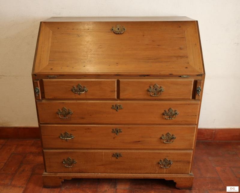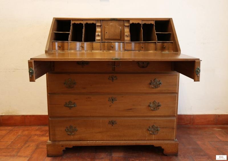 Papeleira com três gavetões a toda a largura e duas gavetas paralelas na primeira andada. Cada gavetão dispões de uma fechadura e dois puxadores de espelho recortados e dois pingentes do mesmo metal, um em cada lado das gavetas superiores, ligados a duas traves que suportam o tampo da papeleira, quando aberta; este é liso e oblíquo, com fechadura e puxador. O interior compõe-se de escaninhos recortados e gavetas onduladas, ladeando o nicho central com pequena pontinha, Ilhargas lisas; pés cantonais recortados em formas onduladas. Ferragens já posteriores.