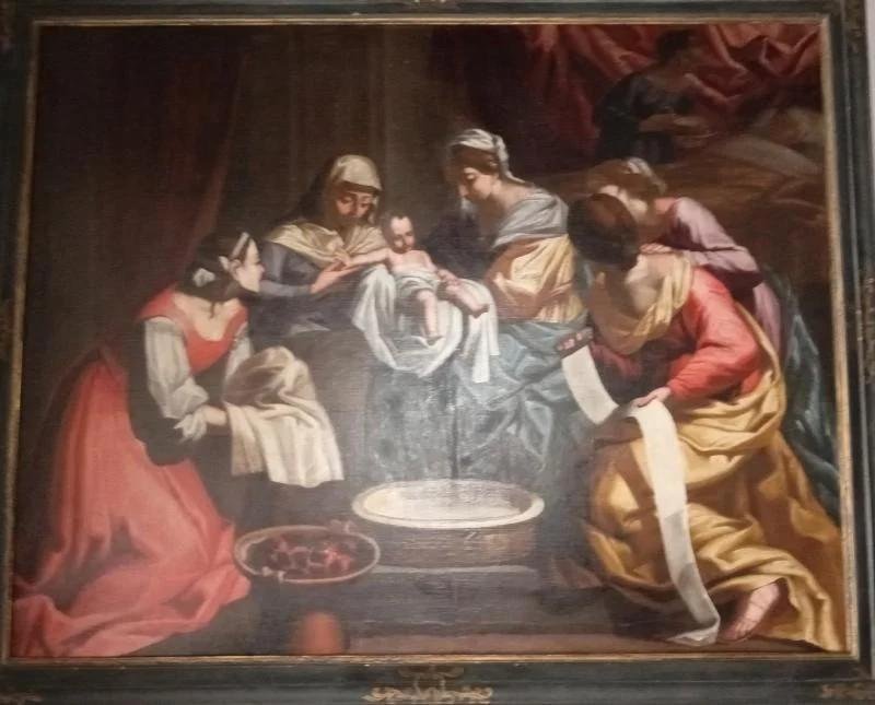 Virgem menina, envolvida em panos e faixas, rodeada por um grupo de cinco mulheres, após o banho. Em primeiro plano, a tina de água e um fogareiro com brasas. Em plano recuado e na parte superior direita, Santa Ana deitada em vasto leito encimado por um farfalhudo cortinado vermelho. Servem-lhe a refeição. A cena do banho da Virgem destaca-se contra um fundo de tons escuros. Moldura preta com motivos florais em dourado.Século XVII (finais)