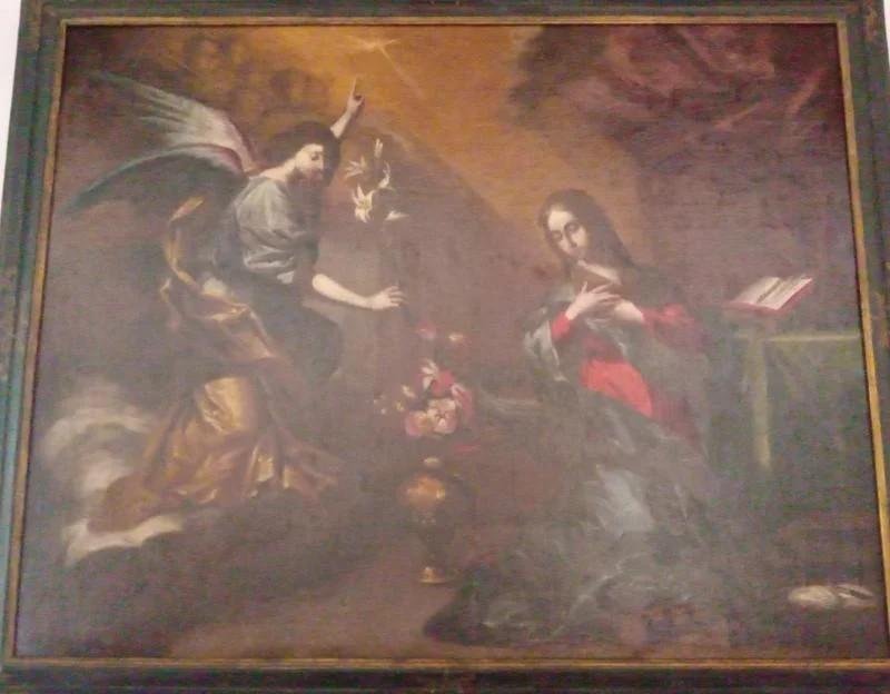 O anjo da Anunciação aparece à Virgem, trazendo na mão direita a açucena, símbolo da castidade, enquanto com a esquerda aponta a luz divina. Maria, no lado direito,com vestes profundamente pregueadas, está ajoelhada junto ao livro de orações. Entre as duas figuras divinas está um pano de flores. Vindo do céu está a pomba do Espírito Santo que projecta a luz sobre Maria. No canto superior esquerdo encontram-se anjinhos. Fundo de tonalidades castanhas escuras. Moldura preta com motivos florais em dourado.