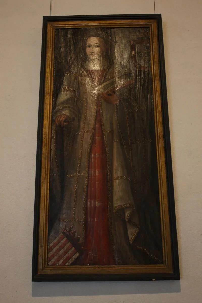 Rainha Santa Isabel representada a corpo inteiro e de pé. Veste rico traje vermelho e manto claro debruado a pérolas. O rosto é dado a 3/4. Na cabeça a coroa. Tem brincos e colares de pérolas. A mão direita apoia-se sobre um bastão pequeno com cabo, enquanto na esquerda segura um livro aberto. No canto superior direito brasão, representando as armas de Portugal. No canto inferior esquerdo outro símbolo heráldico- o brasão de Aragão- que consta de um polígono listado de dourado e vermelho, com uma coroa na parte superior direita. Moldura dourada e preta. Não assinado.