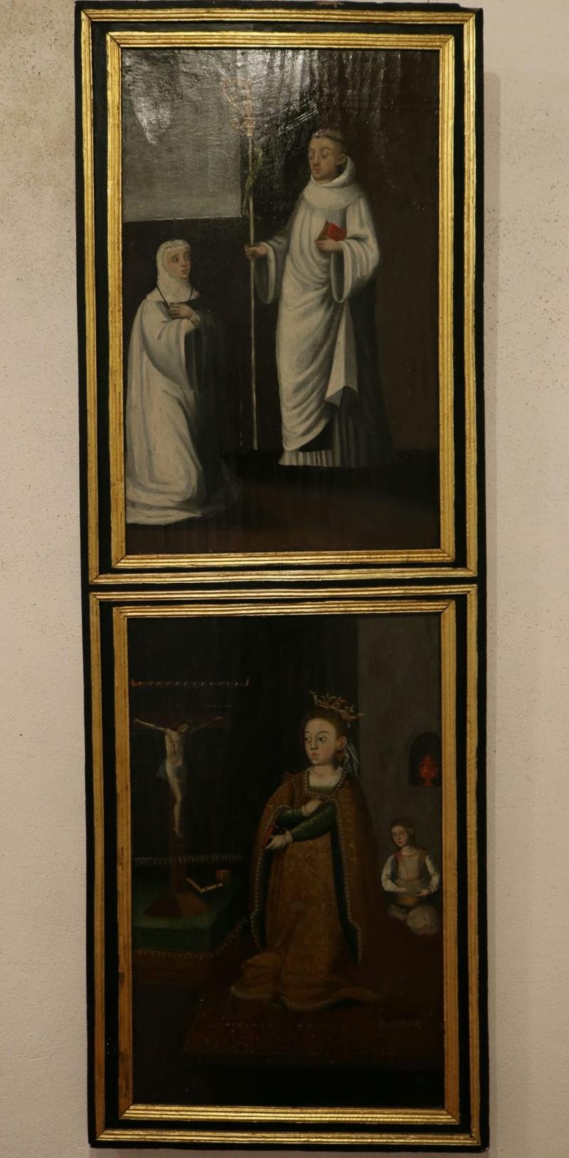 Santa Mafalda, em trajes nobres, aparece a orar em frente a um crucifixo. A coroa na cabeça, indic...