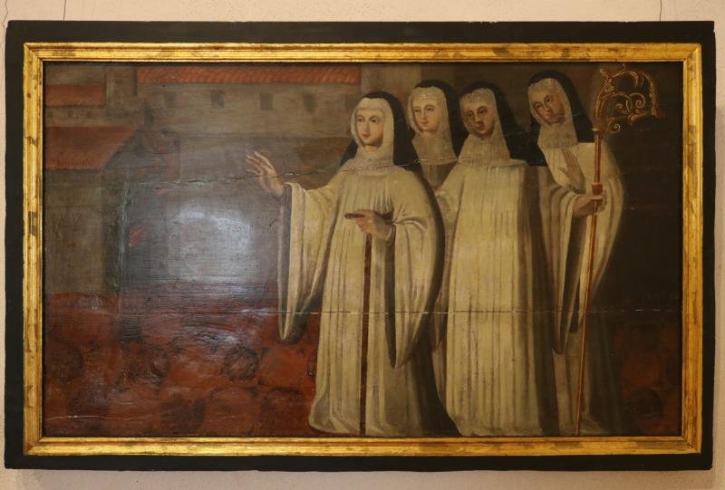 Composição em que as figuras se distribuem na horizontal: à direita, quatro monjas cistercienses, a...