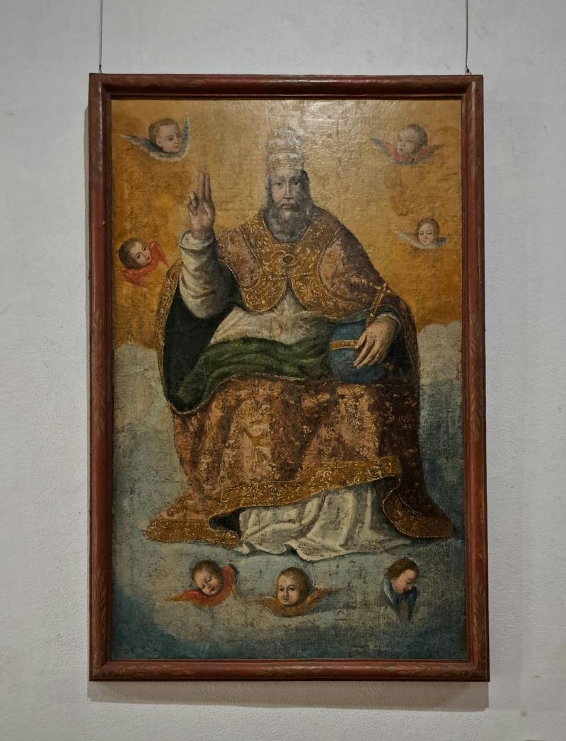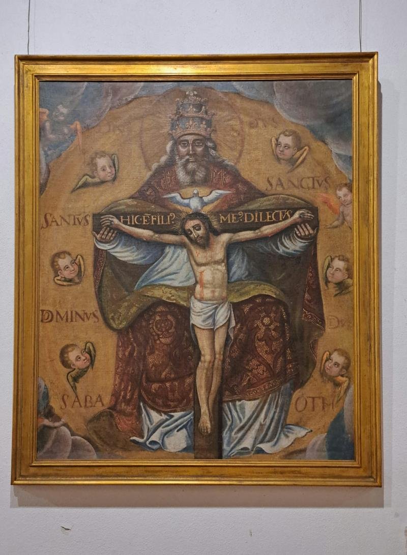 Representação da Santíssima Trindade assumindo Deus Pai a forma de homem idoso, de mitra, barbas bra...