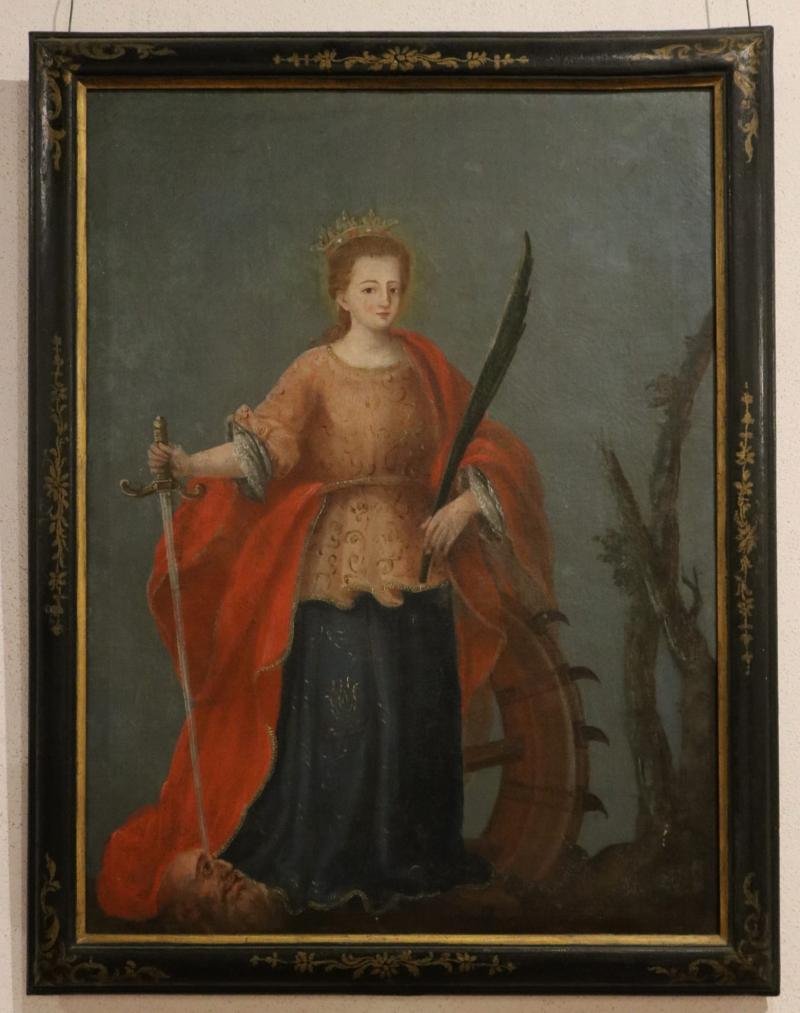 Santa Catarina é representada em corpo inteiro, vestindo túnica castanha curta, sobre saia azul e ma...