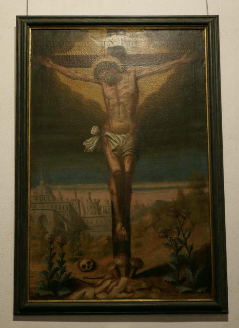 Cristo, crucificado e morto, tem a cabeça tombada para o peito. No topo do madeiro a inscrição "J. N...