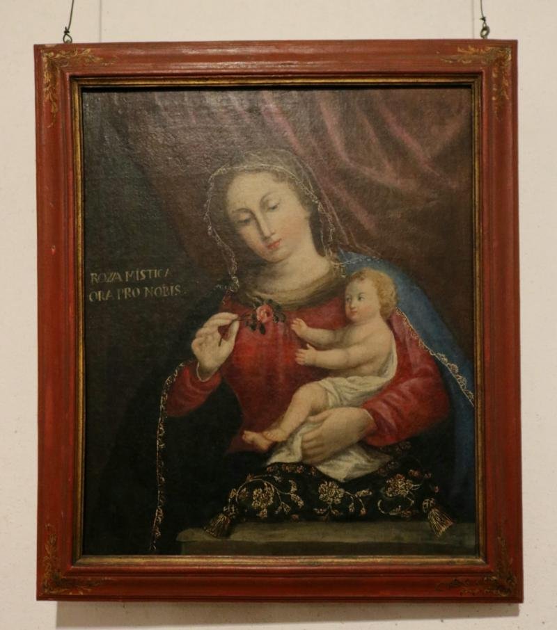 Maria, de túnica vermelha e manto azul, com renda fina dourada, e mantilha na cabeça, segura na mão ...