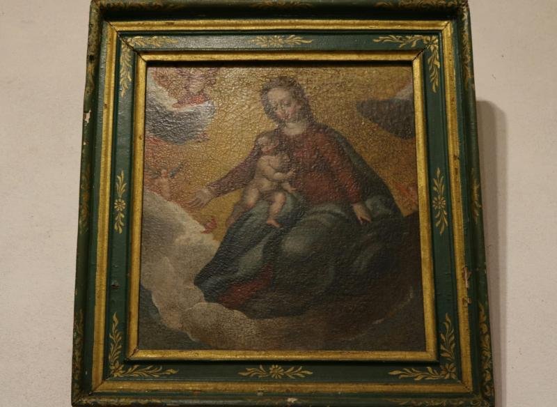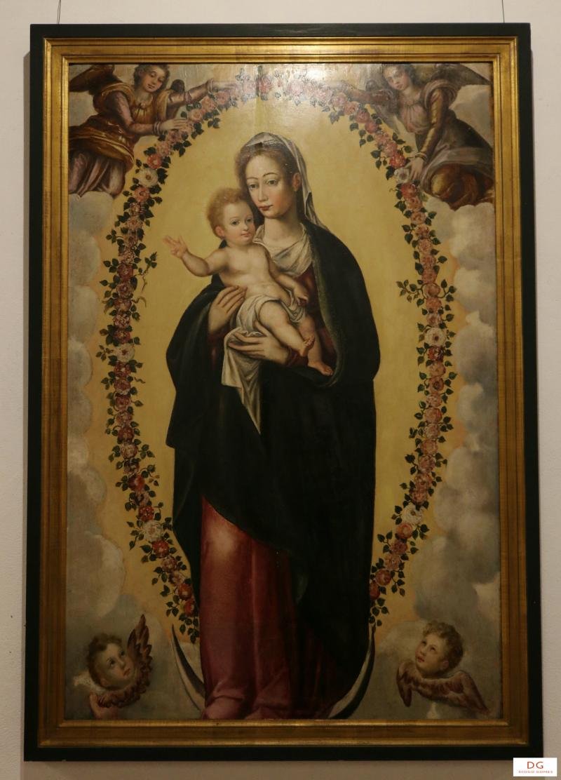 Nossa Senhora coroada, segura no regaço o Menino e na mão direita uma maçã. Está sentada num trono ...
