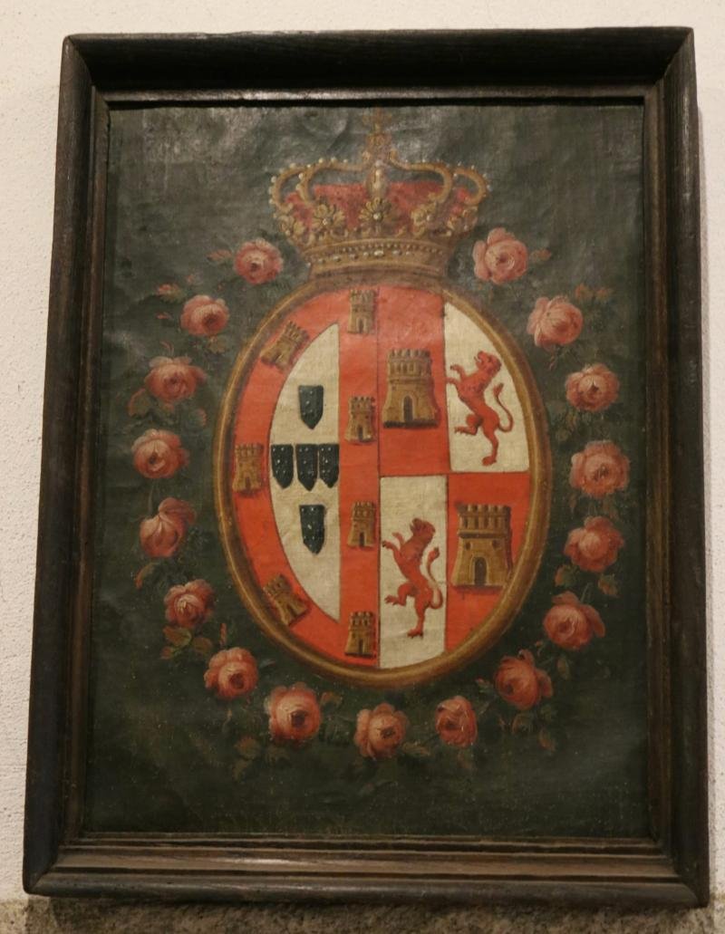 Brasão de formato oval rematado por coroa dourada com pérolas e coifa vermelha. O interior do brasã...