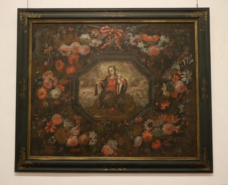 Composição em que se destaca uma exuberante cercadura de flores sobre fundo escuro, lembrando o tema...