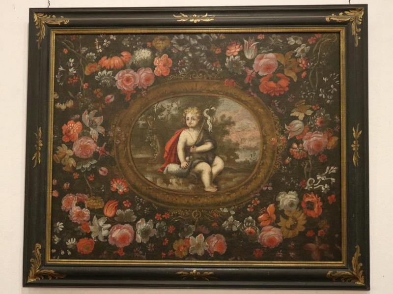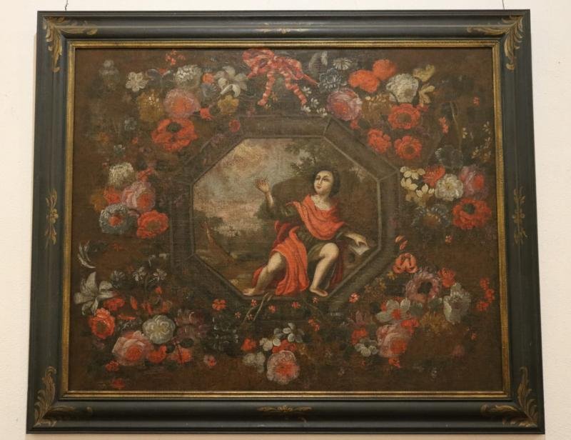 Representação de São João Batista menino dentro de uma moldura pictórica oval. Está sentado, seguran...