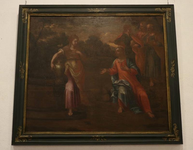 Representação do episódio bíblico do encontro de Cristo com a Samaritana junto ao poço. A postura de...