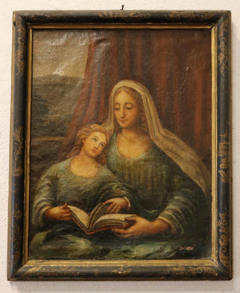 A Virgem encosta-se ao ombro de Santa Ana enquanto folheia um livro. Por trás uma cortina vermelha ...