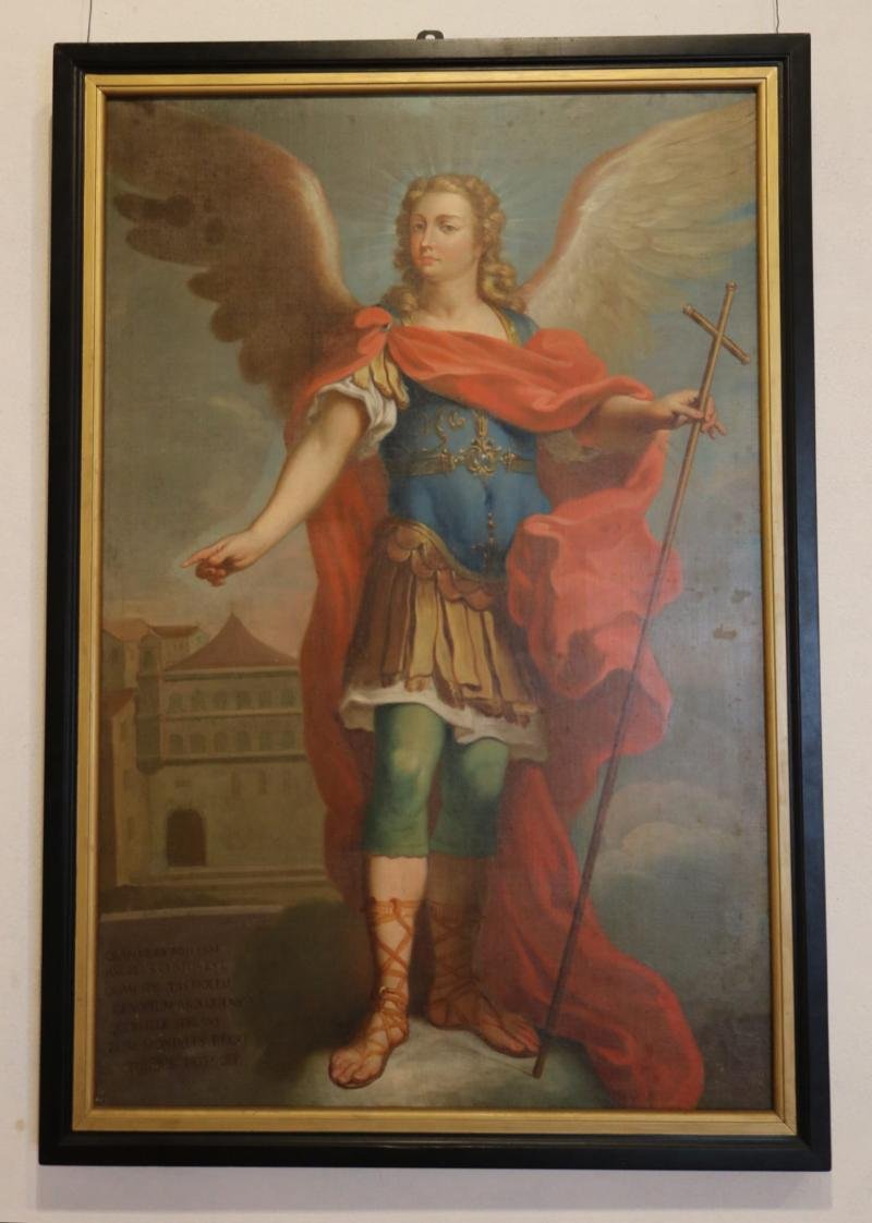 São Miguel ou o Anjo Custódio é aqui representado em traje de centurião romano, de vasta capa vermel...