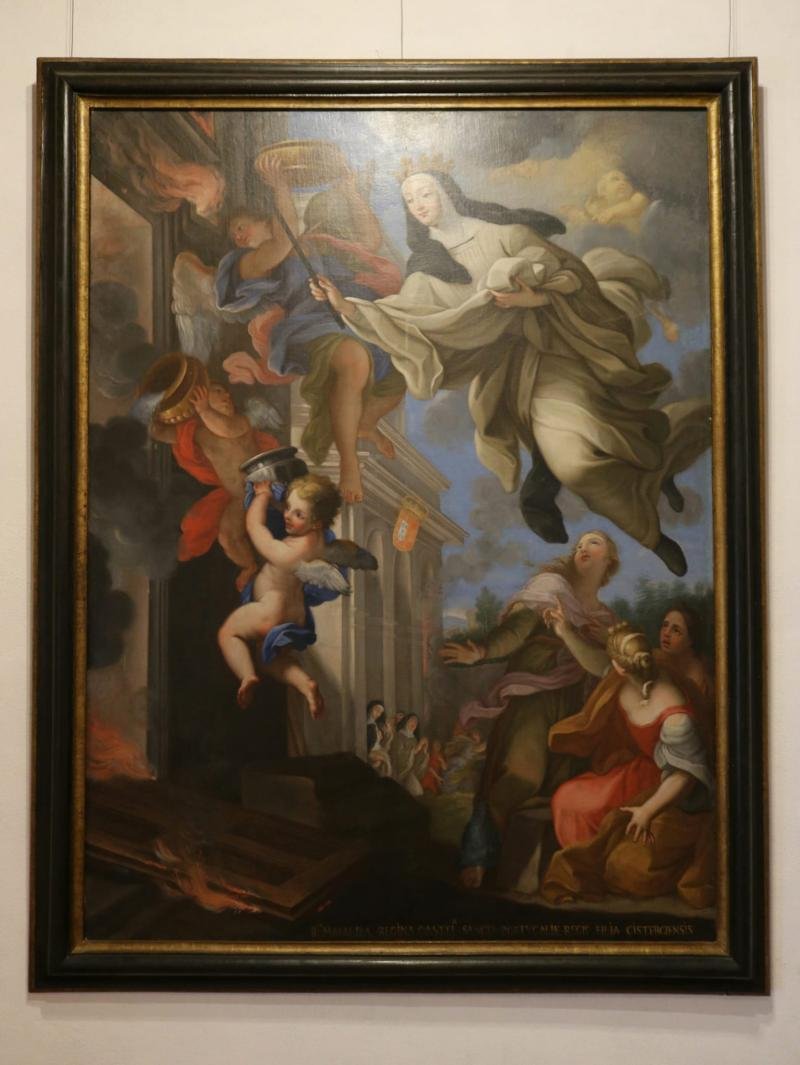 Santa Mafalda em traje cisterciense, «com o cetro e a coroa a seus pés, sobre a qual paira um grupo...