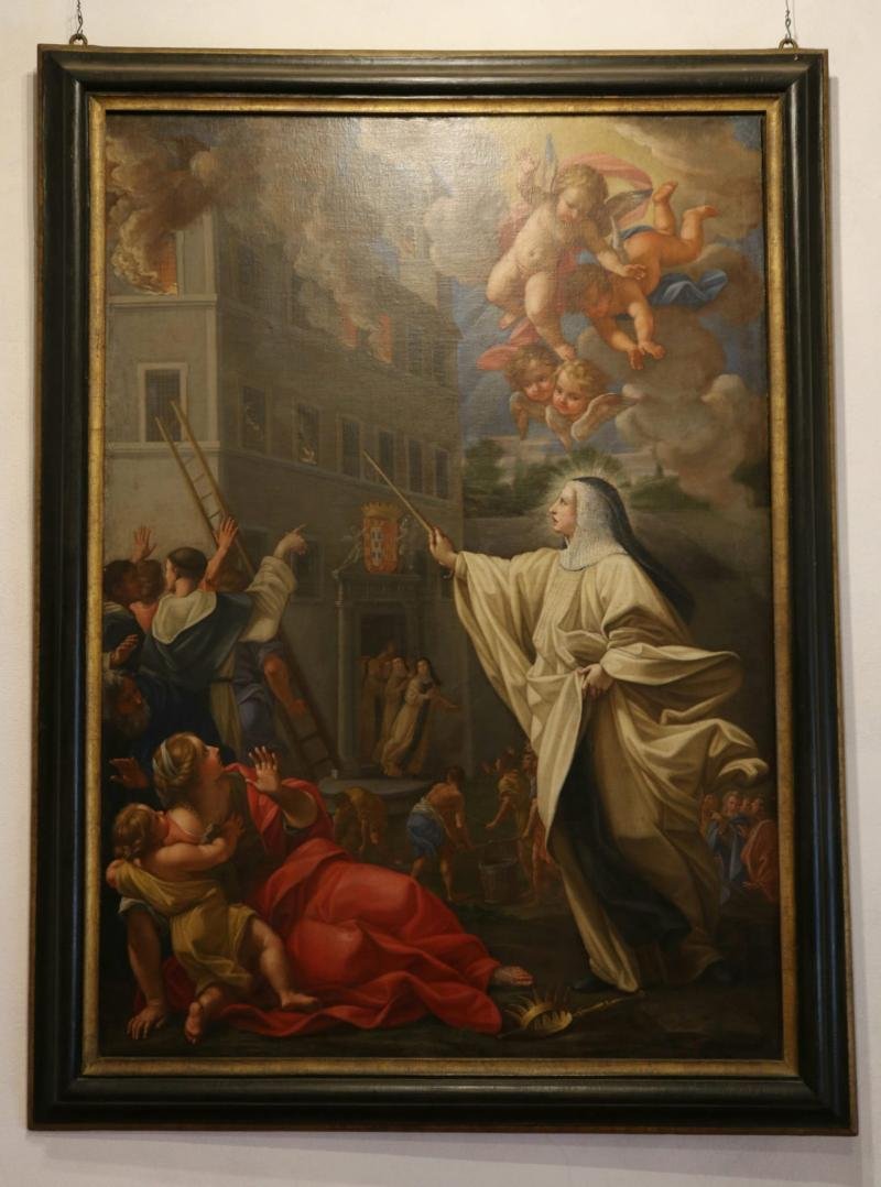Santa Mafalda coroada e em traje cisterciense, surge no ar para salvar o mosteiro das chamas. Anjos ...