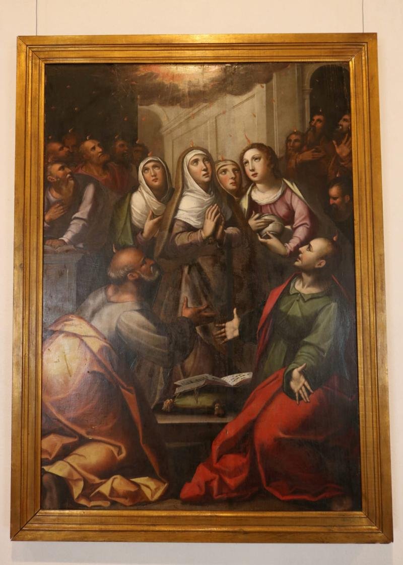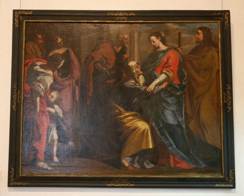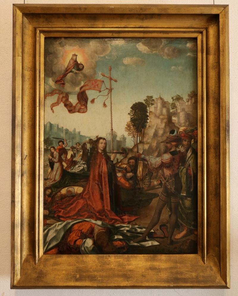 Ao centro, a figura de santa Úrsula ajoelhada é trespassada, no pescoço, pela flecha, enquanto empu...