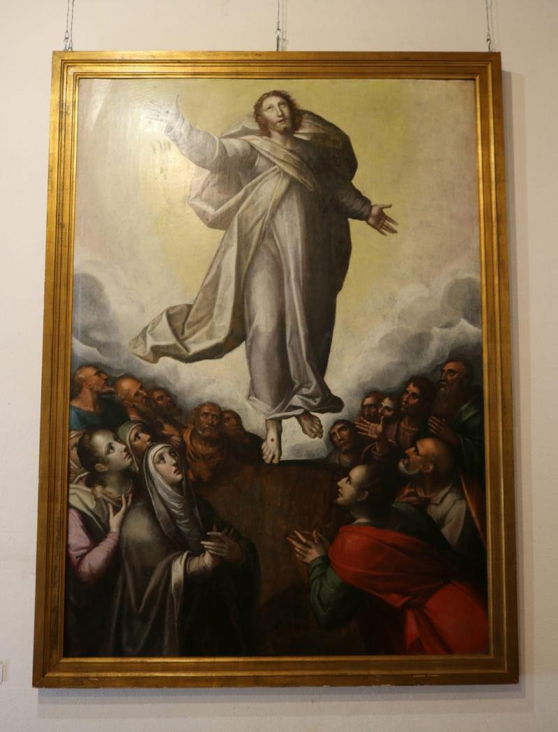A composição desenvolve-se em dois planos: num plano superior, luminoso, envolto em nuvens etéreas, ...