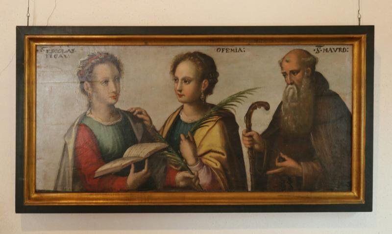 Painel transversal. Representação de três santos. Por ordem, da esquerda para a direita, as inscriçõ...