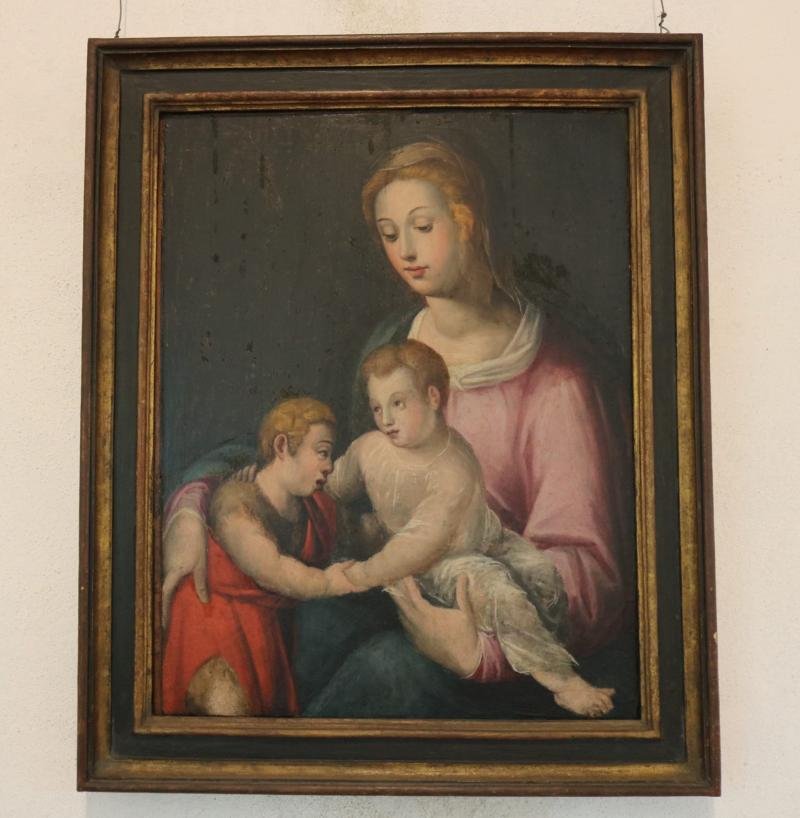 No volante ou painel central, está a virgem sentada, tendo ao colo o Menino despido, enquanto segura...