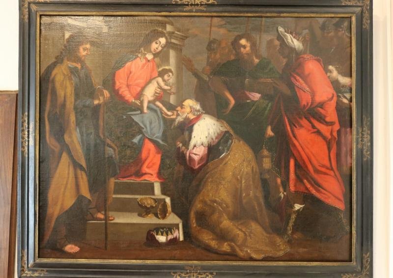 Virgem, sobre uma escadaria, apresenta o menino no seu regaço, aos Reis Magos. São José , a seu lado...