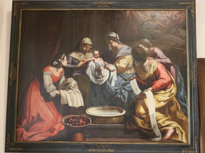 Virgem menina, envolvida em panos e faixas, rodeada por um grupo de cinco mulheres, após o banho. E...