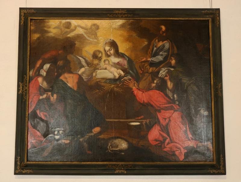 Virgem e o Menino, iluminados por uma luz amarelada, são objecto de adoração de pastores e mulheres ...
