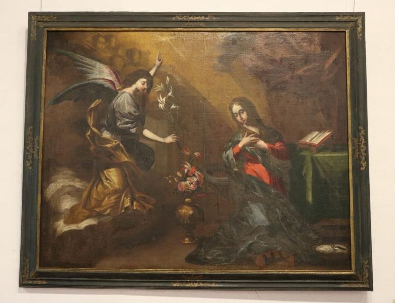 Num plano central, está a Virgem em atitude de oração. A seus pés, um livro. Em primeiro plano, dois...
