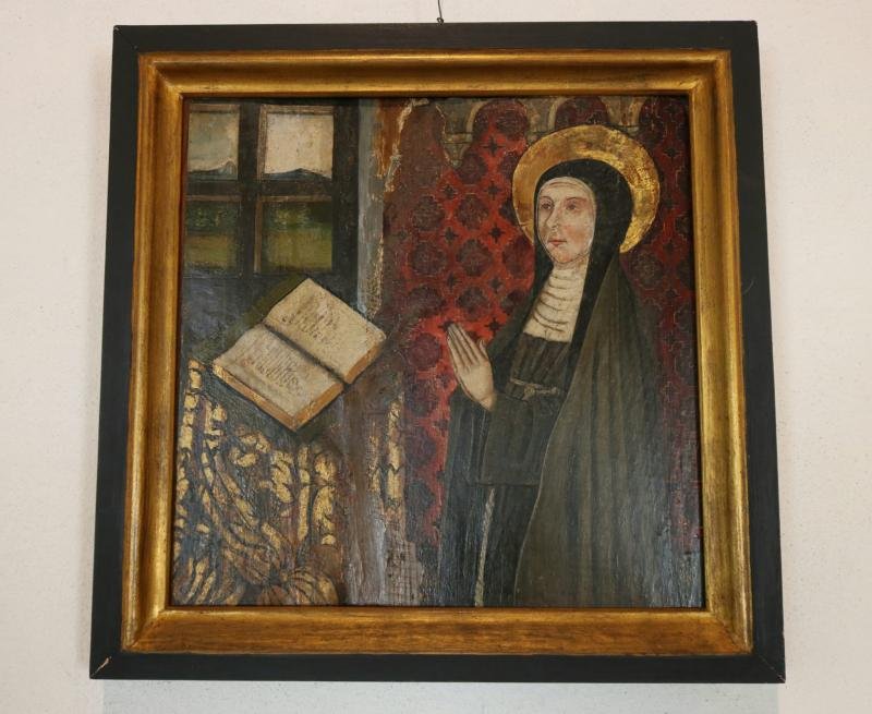 Santa Mafalda, em trajes abaciais da Ordem de Cister, tem na mão esquerda um livro aberto e na direi...