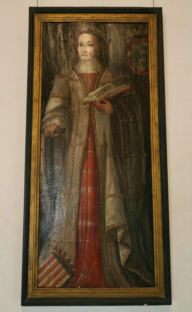 Rainha Santa Isabel representada a corpo inteiro e de pé. Veste rico traje vermelho e manto claro de...